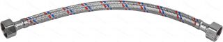 Гибкая подводка 12 мм представляет собой шланг для воды из EPDM (нетоксичный каучук) оплетенный нитью из нержавеющей стали. Оплетка из высококачественной нержавеющей стали AISI 301 состоит из 7 нитей, толщиной 0,18 мм каждая. Оплетка идет с вкраплениями красных и синих нейлоновых нитей, характеризующих горячее и холодное водоснабжение. Внутренний шланг и прокладка из нетоксичной резины EPDM. Оплетка из нержавеющей стали AISI 301. Накидная гайка из нержавеющей стали AISI 301.Штуцер из никелированной латуни 57-34. Ниппель латунь 57-35.Обжимная гильза из нержавеющей стали 301.