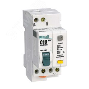 Автоматический выключатель дифференциального тока серии ДИФ-102 DEKraft, 1P+N, ном.ток 16 А, характеристика C, откл.способность Icn 4,5 kA, ток утечки 30 мА, тип - АС, блок дифф.защиты - электронный, ширина - 2 мод. х 18 мм, монтаж - на DIN-рейку. АВДТ применяются в сетях напряжением до 220 В пер.тока для защиты чеовека от поражения электрическим током и электроустановок от сверхтоков и токов утечки. Аппараты ДИФ-102 являются более компактным вариантом АВДТ по сравнению с серией ДИФ-101.